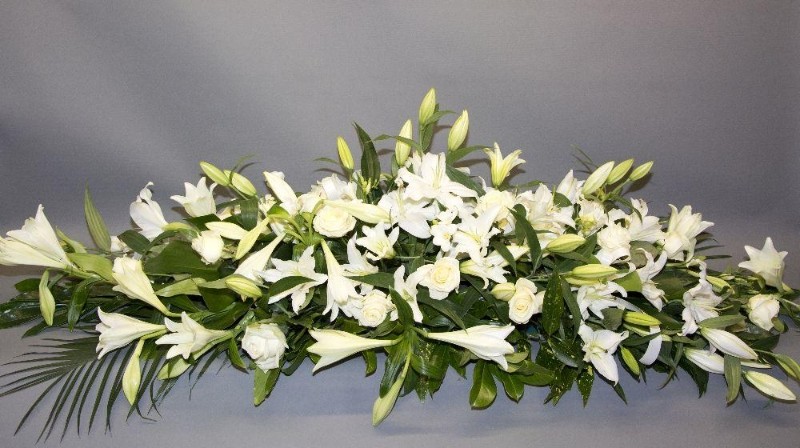 Classic white lily and rose open spray. these flowers are beautifully arranged to create the most elegant spray. This is priced at £195 however smaller and larger options are available over the phone and flowers can be changed for personal preference. (Flowers may vary due to seasonal demands).