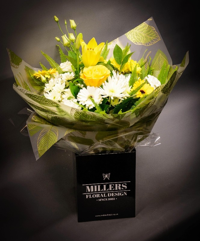 This stunning yellow, white and lime bouquet gives off a clean and fresh look perfect for any occasion. This colour combination is one of our best sellers and we can see why. Brightening peoples homes with its presence. Flowers can be changed for personal preference. (Flowers may vary due to seasonal demands).