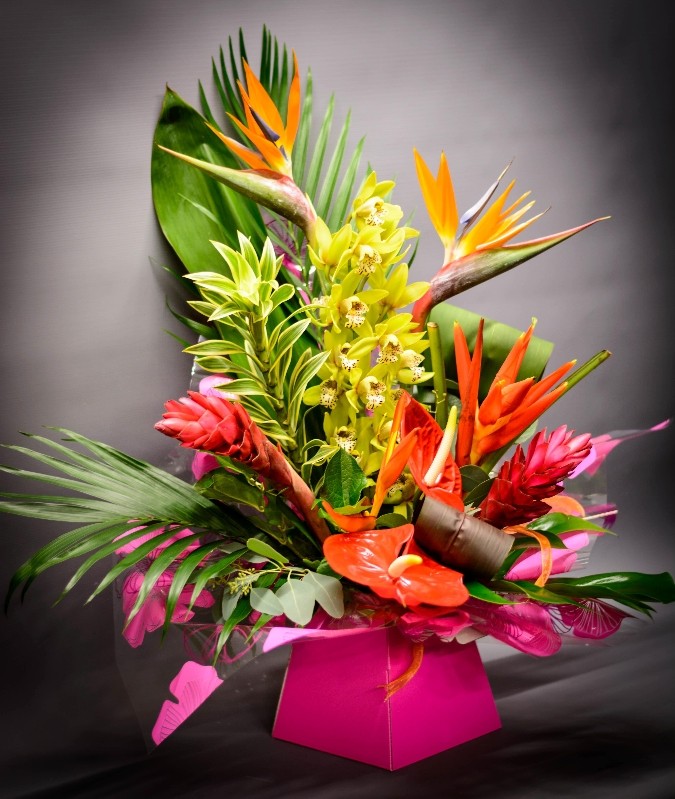 This exotic box is arranged in a floral oasis, so no maintenance is needed, just a touch of water everyday. this arrangement portrays individuality at its best. The most commonly used flowers are orchids, anthuriums and gerberas. Flowers can be changed for personal preference. (Flowers may vary due to seasonal demands).