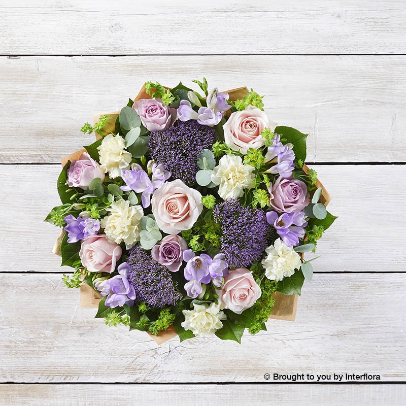 We use a selection of popular stems including pale pink roses, lilac roses, cream carnations, lilac freesias and purple trachelium.