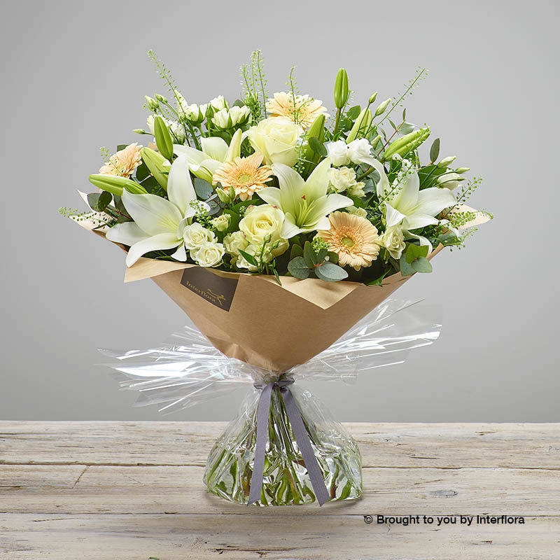 Available 15th July – 4th July 2020 This beautiful and elegant Fond Memories Hand-tied has been designed by skilled florists, to help express heartfelt emotions at a sad time. We use a stunning mix of fresh flowers and seasonal foliage to create Fond Memories in soft, comforting colours. Our florists include white lisianthus, roses, white lilies and germini and finish with eucalyptus and salal tips for green texture.