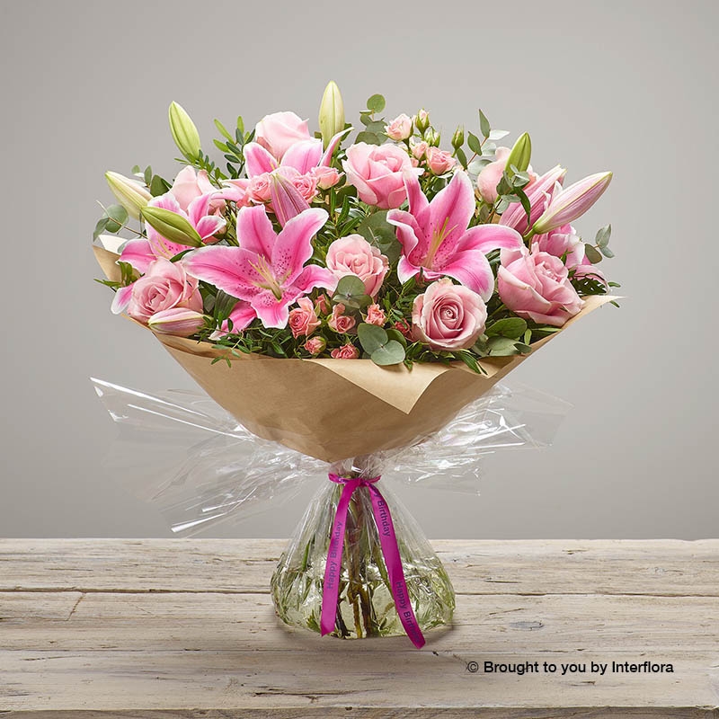 Designed by expert florists, Happy Birthday Pink Pop hand-tied uses some of the most popular and stunning pink flowers – roses and lilies. We carefully source the finest stems to use to create Happy Birthday Pink Pop and use green eucalyptus and pistache to compliment the vibrant pink tones of the lilies and roses.