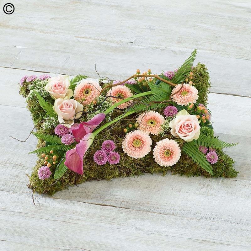 A contemporary design with a woodland feel, this unique pillow posy features pink and peach blooms and willow on a bed of moss.