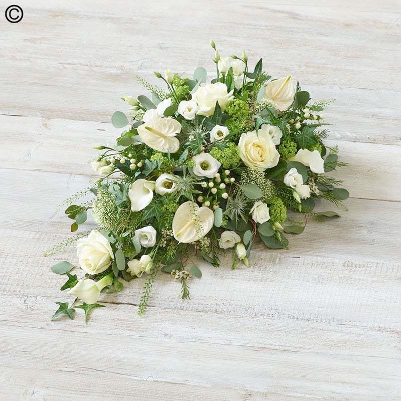 A lush blend of white and green featuring calla lilies, anthurim, and virburnum opulus. Ivy weaves elegantly through the teardrop shape.
