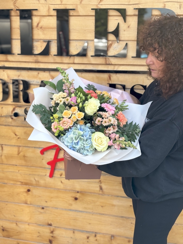 Embrace the soft hues of the season with our Autumnal Pastel Bouquet, a perfect blend of delicate florals that capture the beauty of autumn in a unique and subtle way. This hand-tied arrangement features an elegant mix of pastel roses, hydrangeas, and dahlias, with accents of eucalyptus and seasonal foliage, offering a fresh take on traditional fall colors. Ideal for adding a touch of warmth and sophistication to any space, this bouquet is the perfect gift for a loved one or a seasonal treat for yourself.