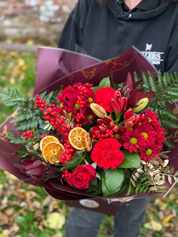 Introducing our Traditional Christmas Hand-Tied Bouquet, a stunning arrangement of rich reds and lush greens, embodying the classic holiday spirit. This elegant bouquet features festive red blooms complemented by seasonal greenery, creating a timeless display perfect for celebrating the season. Carefully crafted to evoke warmth and cheer, it’s ideal for gifting or adorning your holiday table.