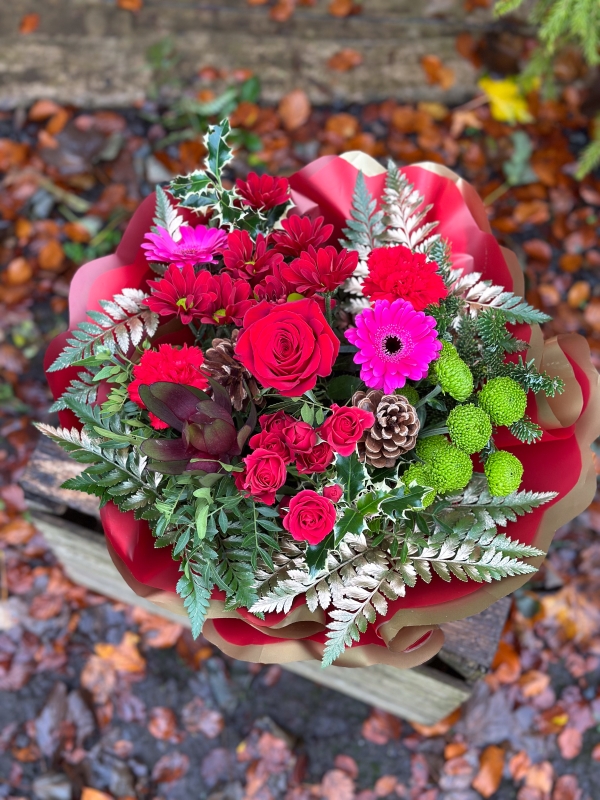 Delight in the festive spirit with our Christmas Gift Box Arrangement, thoughtfully designed in oasis for effortless care and lasting freshness. This small yet charming arrangement bursts with the vibrant reds of seasonal blooms and lush green foliage, creating a joyful and eye-catching display. Perfect for brightening up any holiday space or as a thoughtful gift, this arrangement captures the essence of Christmas cheer. Simple to maintain, it’s an easy way to spread festive joy. Order now to add a touch of holiday magic to your celebrations!