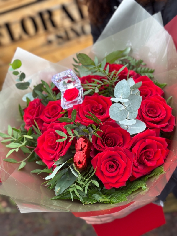 Nestled beautifully at the heart of the bouquet, the freeze-dried Forever Rose, encased in its elegant display, is a timeless symbol of eternal love. While the fresh roses dazzle for days, this Forever Rose will serve as a lasting keepsake, reminding your loved one of your unending devotion for years to come.